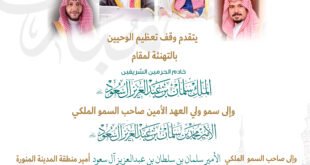 يسر مجلس نظارة وادارة و أعضاء الشرف ومنسوبو وقف تعظيم الوحيين بالمدينة المنورة أن يرفعوا أسمى التهاني والتبريكات