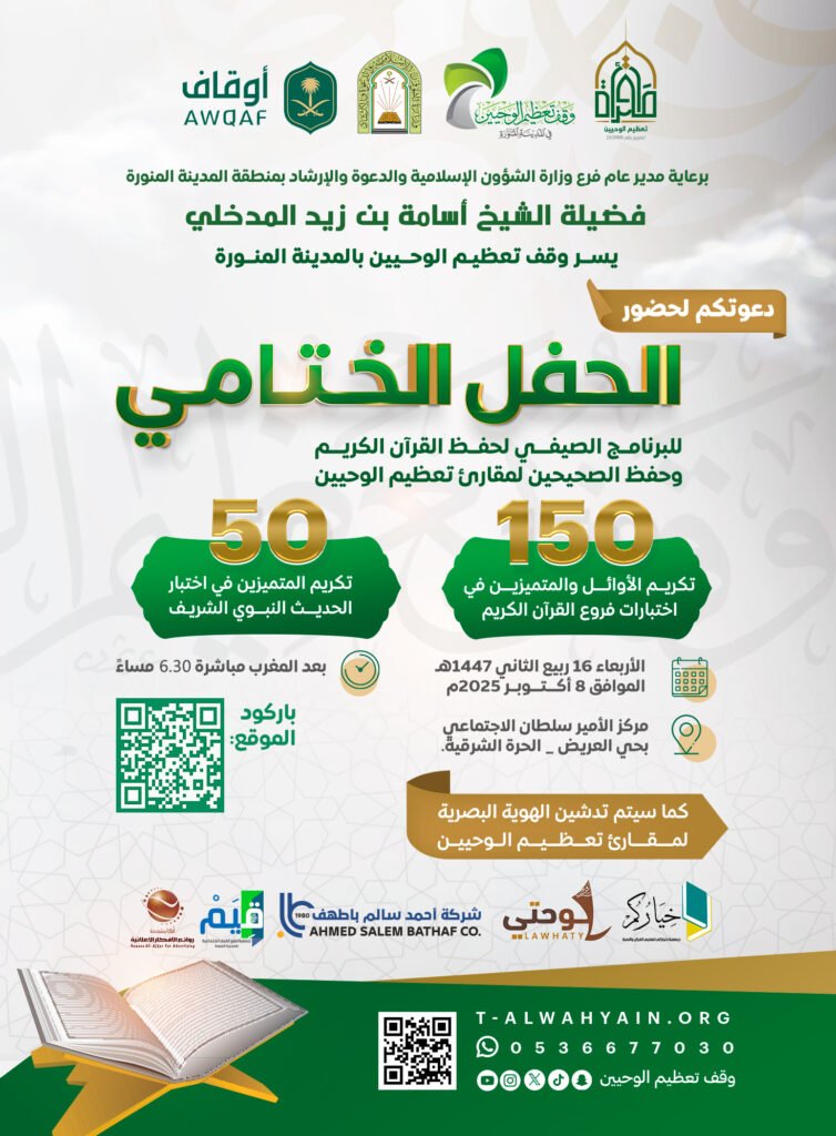الرئيسية / الإعلانات / دعوة لحضور الحفل الختامي للبرنامج الصيفي لحفظ القرآن الكريم والصحيحين لمقارئ تعظيم الوحيين
